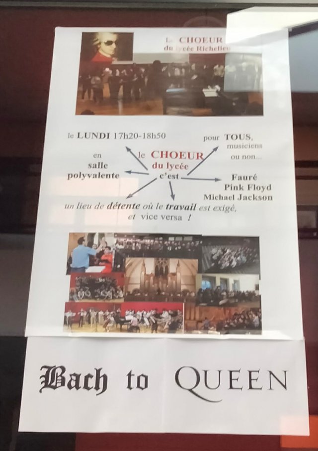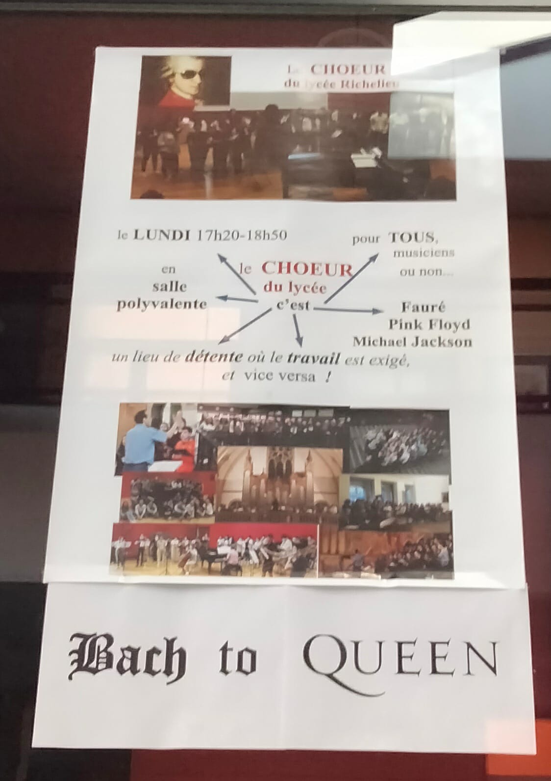 L’occasion, en cette rentrée, de souligner la reprise des activités du choeur du lycée : Ouvert à tous, musiciens confirmés ou simples mélomanes, élèves ou enseignants, prêts à chanter aussi bien Bach que Queen ou du jazz... Rendez-vous en salle polyvalente le lundi de 17h20 à 18h50.